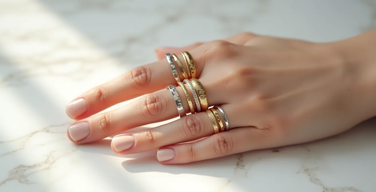- Der Schlüssel liegt darin, einen „Helden-Ring“ als Fokuspunkt zu wählen und eine visuelle Harmonie durch den Mix von Texturen und Metallen zu schaffen.
